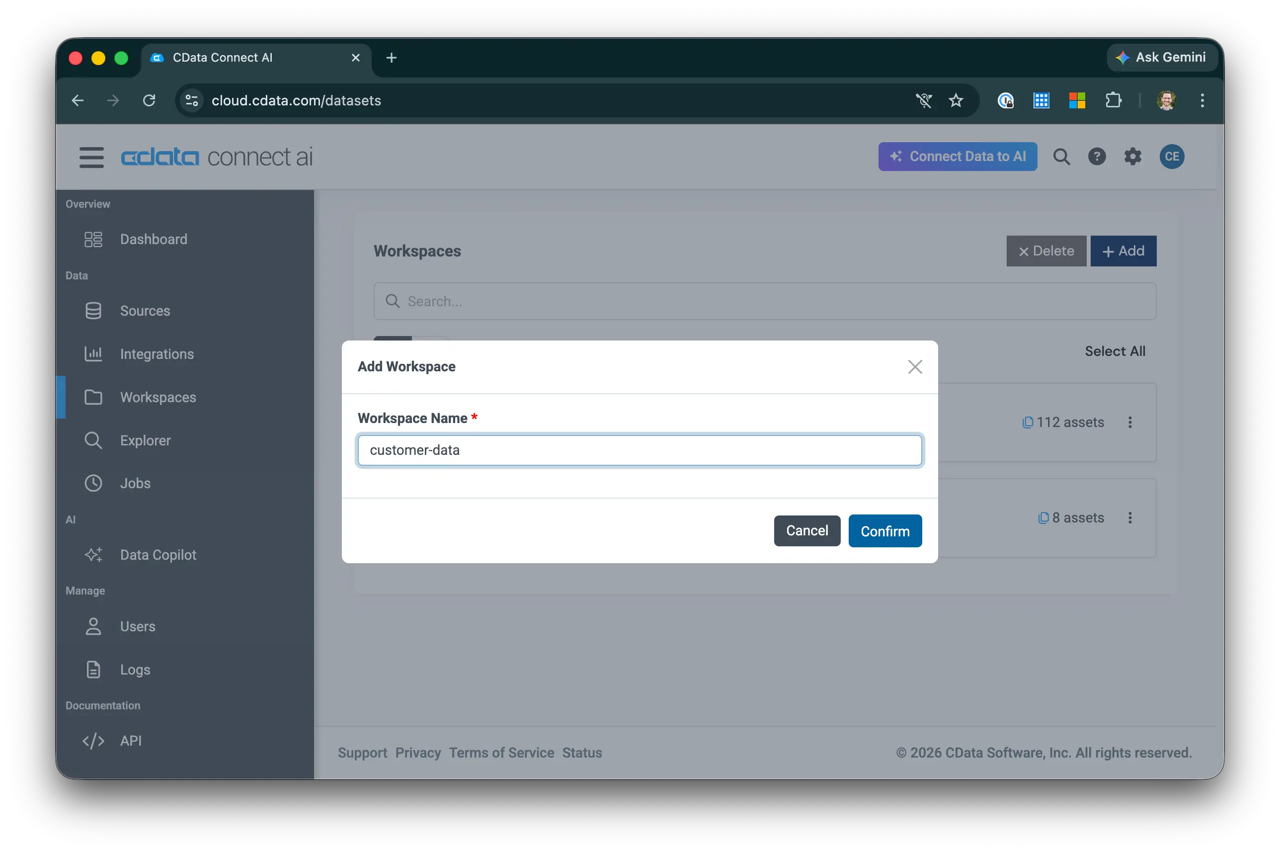 - Workspace Name に customer-data と入力し、Confirm をクリックします。NOTE: ステップ 5 の Custom SQL ツールではこの名前を使用します。別の名前を選んだ場合は、SQL を適宜更新してください。