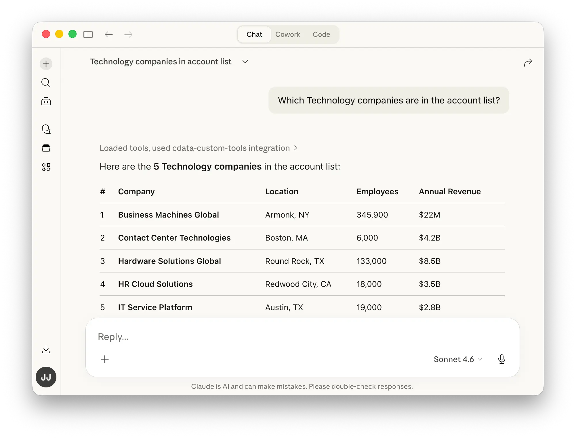 - Claude Desktop で新しい会話を開きます。利用可能な MCP サーバーとして cdata-custom-tools が表示されるはずです。