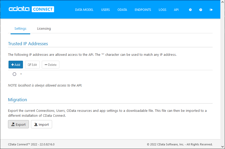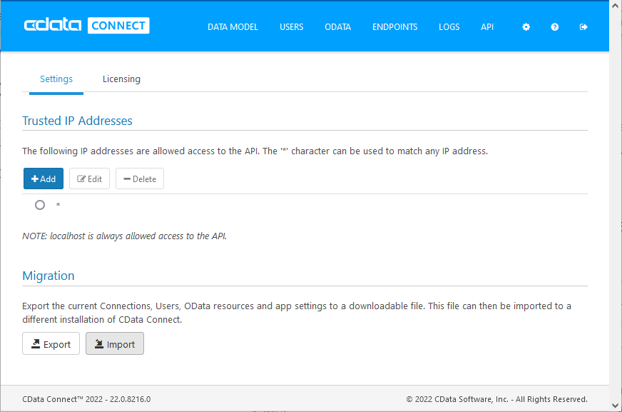 インポート機能は、CData Connect の設定ページにあります。歯車アイコン()をクリックするか、https://my_connect_url/about.rst に移動してください。エクスポートボタンとインポートボタンは、Migration セクションにあります。
