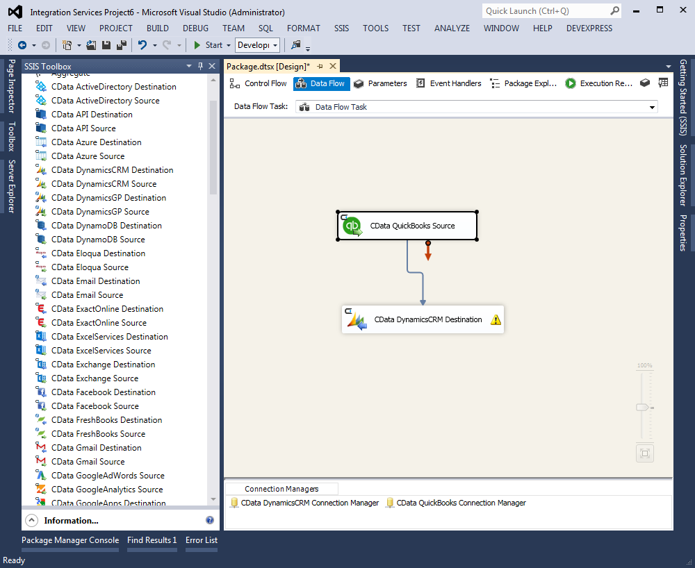 CData SSIS Components を使用すると、顧客データを CRM で管理する際に発生しがちな手動プロセスを簡単に自動化できます。これらのコンポーネントを使えば、Dynamics CRM と QuickBooks をデータソースおよびデータの同期先として扱えます。ここでは、QuickBooks の顧客を CRM アカウントに転送する10ステップの手順をご紹介します。