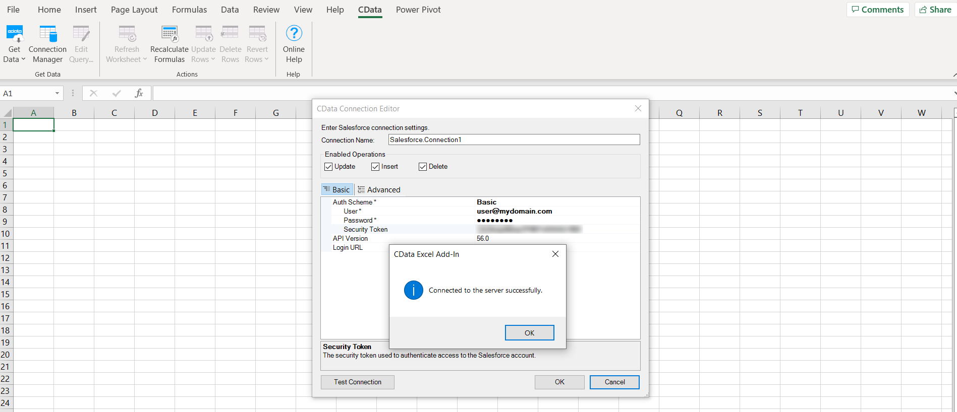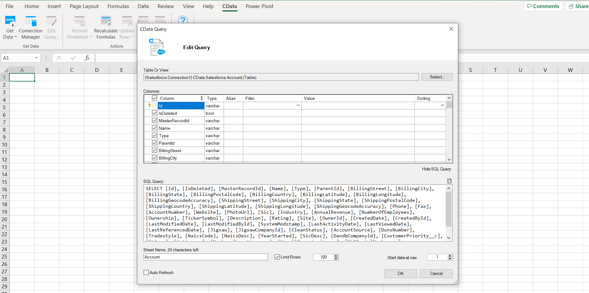 Excel を開き、CData タブをクリックして、Get Data -> From Salesforce を選択します