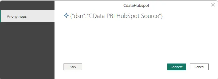 - Data Source Name: CData PBI HubSpot Source(または DSN 設定時に指定した名前)