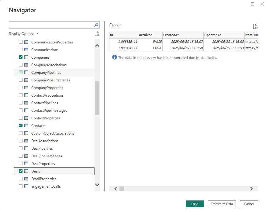 - ナビゲーターが開き、Power BI で使用可能な HubSpot オブジェクトが表示されます。オブジェクトはテーブルとしてモデル化されているため、Power BI から簡単に使用できます。Power BI で分析したいオブジェクトを選択し、「読み込み」をクリックしてデータを Power BI にインポートします。