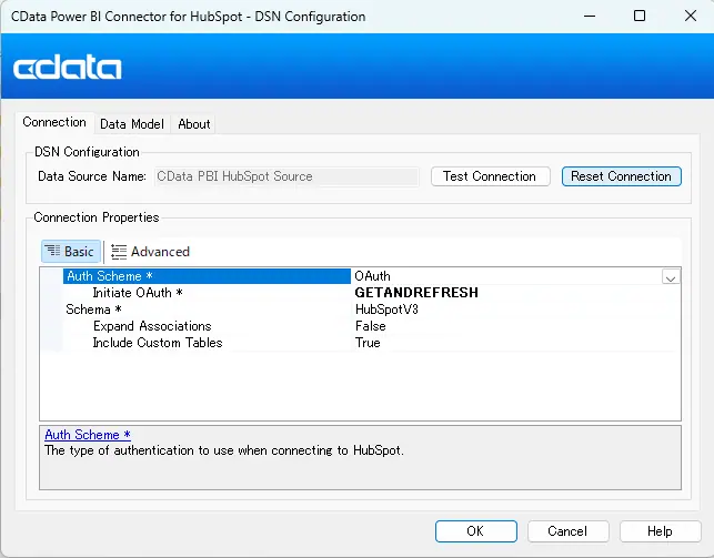 - インストール完了後、DSN(Data Source Name)設定ウィンドウが開きます。以下は CData Power BI Connector for HubSpot から HubSpot に接続するための基本設定です。カスタマイズについてはヘルプドキュメントを参照してください。