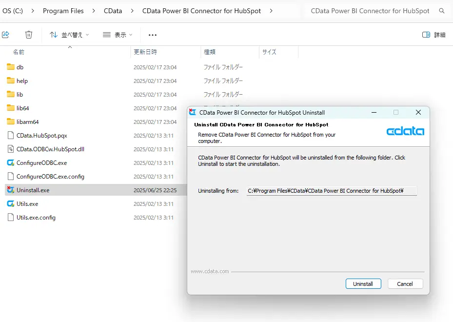 CData Power BI Connector for HubSpot のインストールフォルダにある Uninstall.exe をダブルクリックし、[Uninstall] ボタンをクリックすると製品がアンインストールされます。