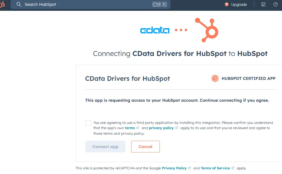 - 「Test Connection」をクリックします。ブラウザが開き、HubSpot アカウントへのアクセスを認可する画面が表示されます。