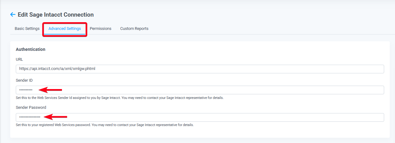 CData Sync または CData Connect AI で Sender ID とパスワードを使用するには、Sage Intacct 接続の Advanced Settings タブにある Sender ID および Sender Password フィールドに入力してください。