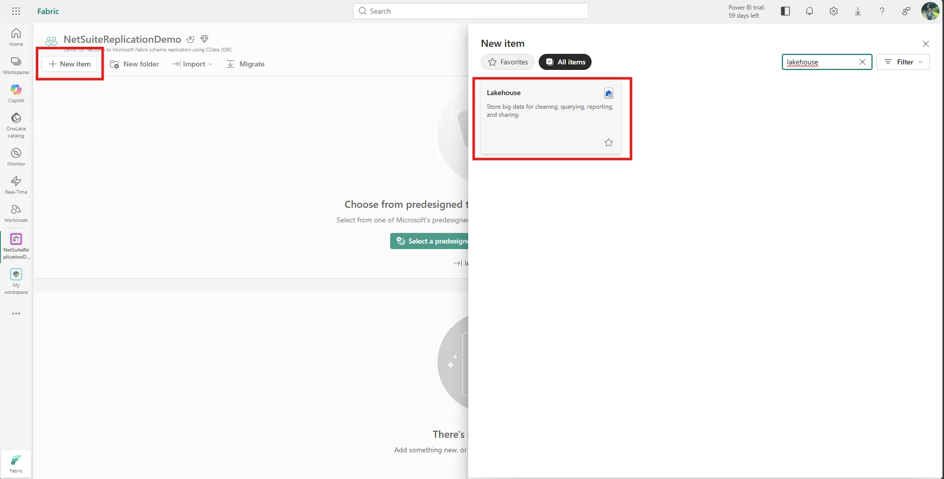 - Lakehouse に名前を付け(例: NetSuiteLakehouse)、Create をクリックします