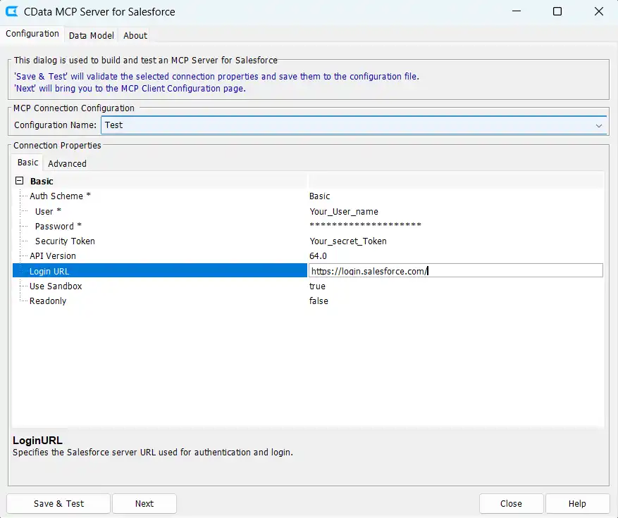 - Login URL:Salesforce サーバーの URL を指定します(本番環境以外の場合はサンドボックス URL を使用してください)