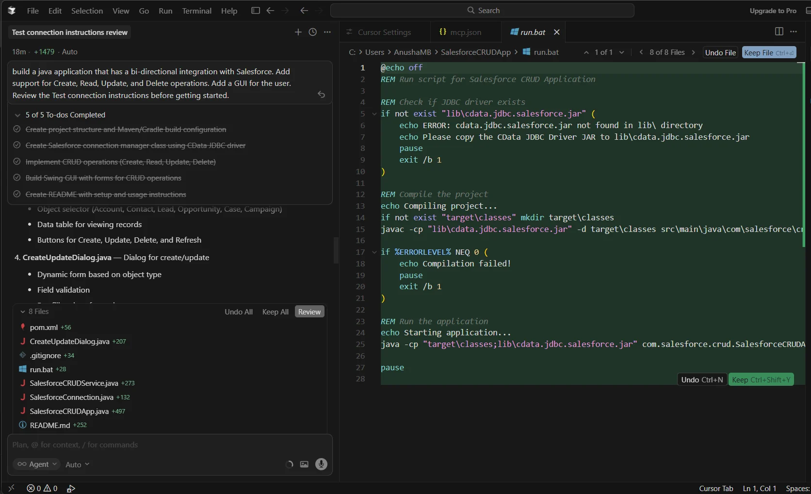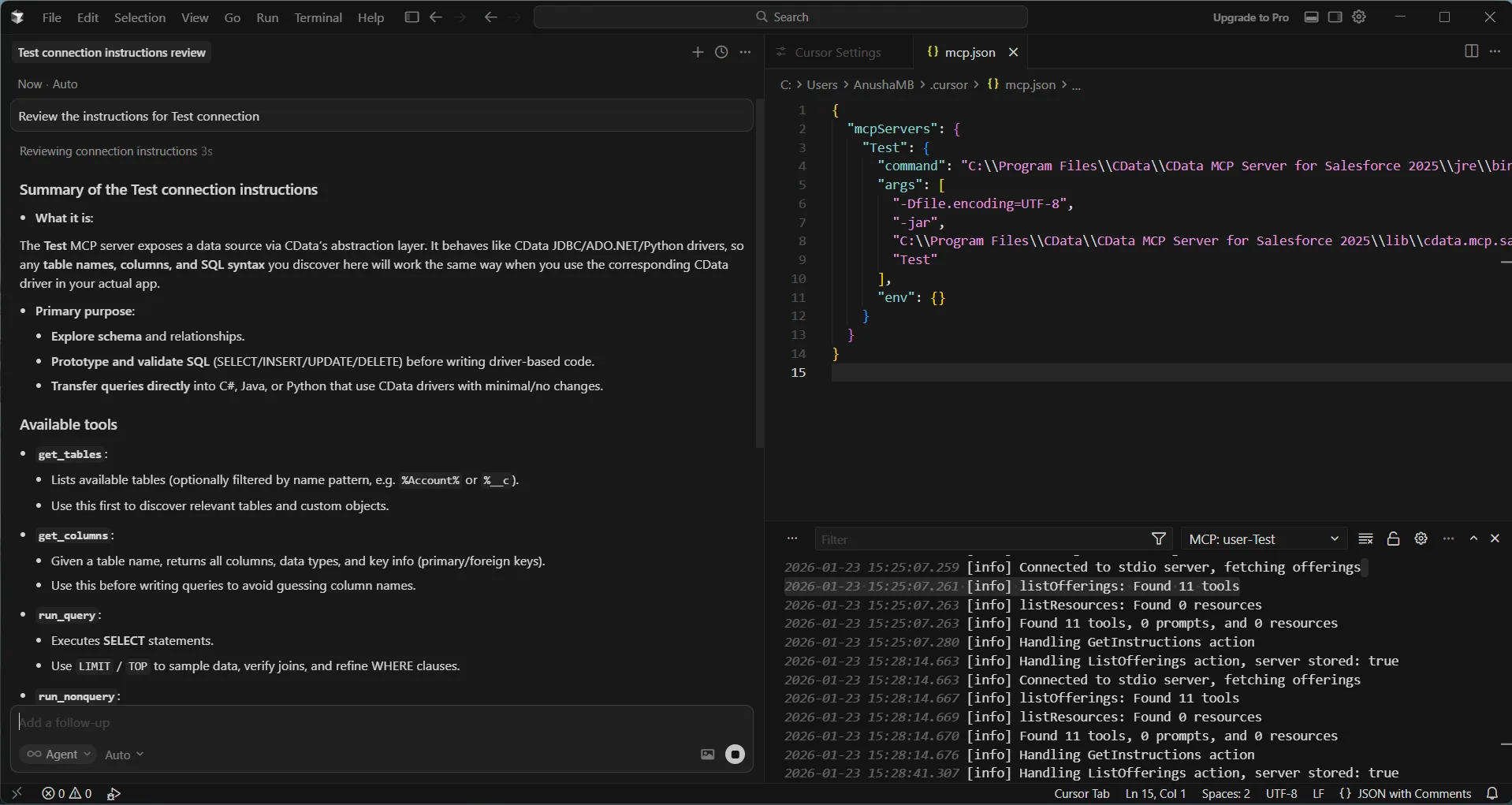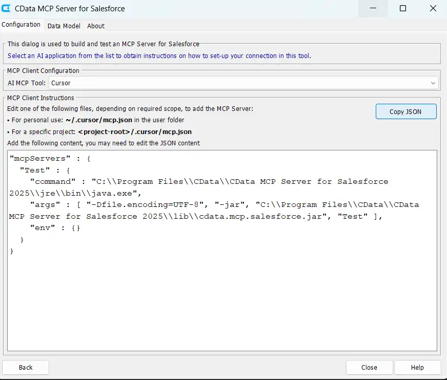 認証には、上記のプロンプトで指定したように、CData JDBC Driver for Salesforce から生成される接続文字列を使用します。ドライバーの JAR ファイルとライセンスファイルの両方がプロジェクトに含まれていることを確認してください。MCP 接続の手順により、Cursor に正しいファイルパスが提供され、スムーズに実行できます。