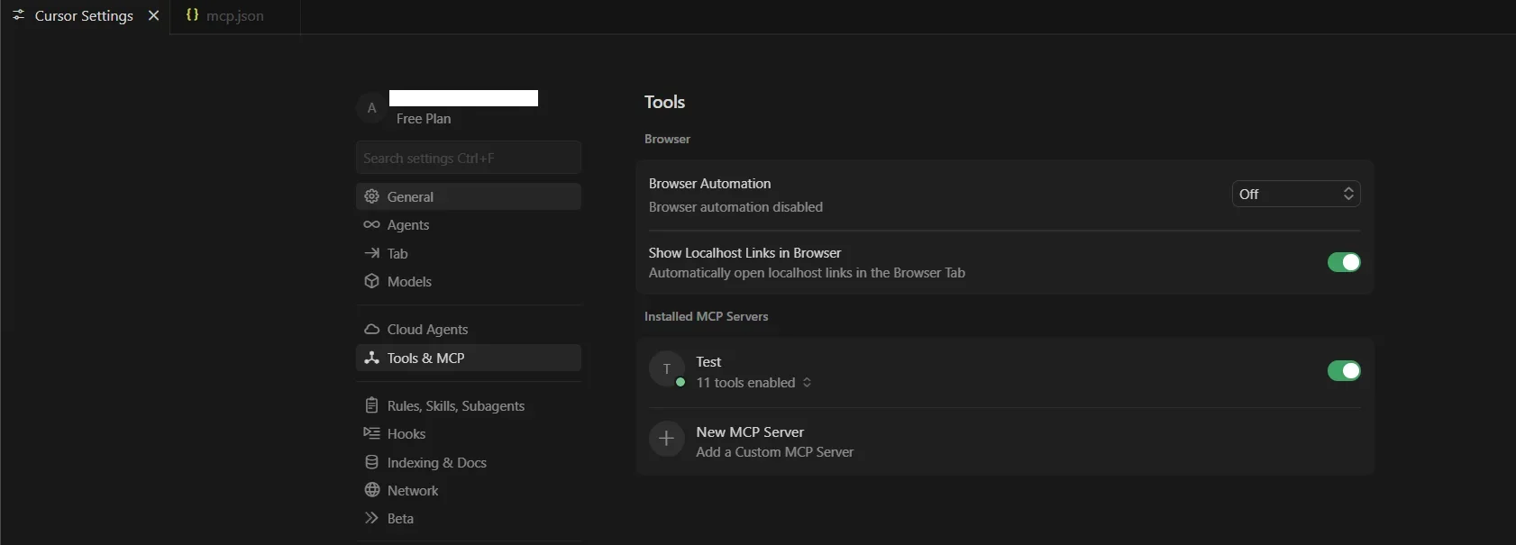 - 接続が成功すると、MCP Servers セクションに設定名と接続済みツールの一覧が表示されます