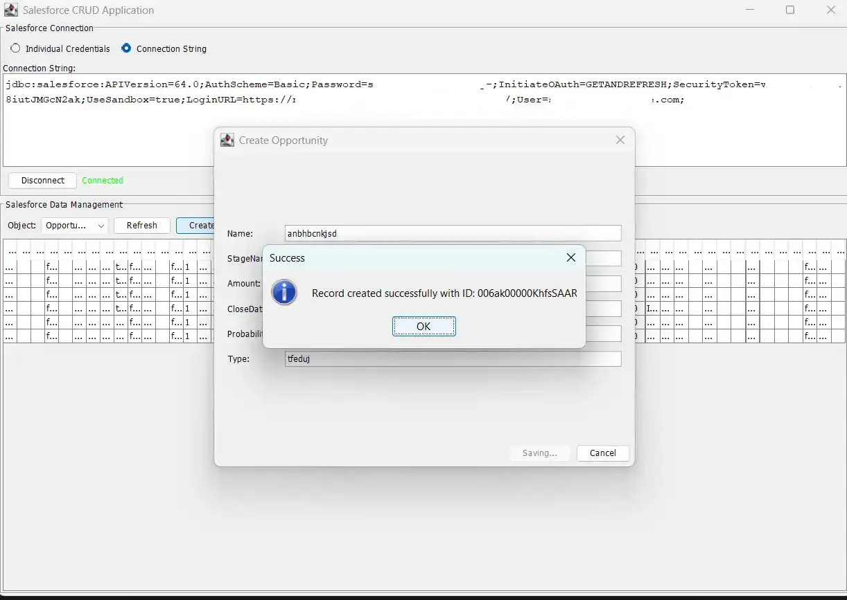 アプリケーションを起動して接続文字列を入力すると、Salesforce への接続が完了します。GUI がポップアップ表示され、Salesforce データに対する CRUD 操作をすべて実行できるようになります。