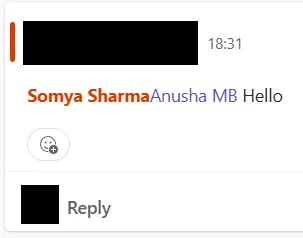 Execute SendMessage Content = 'Hello', ContentType = 'html' TeamId = '477a1356-b063-4320-9dab-fe5e735ea9c7', ChannelId = '19:[email protected]', Mention = 'Somya Sharma,819d298e-ffef-4616-a8ee-8ecb082fa5b4;Anusha MB,bbeca2a4-21f4-4b7e-9e58-b77eb64c13e8';
