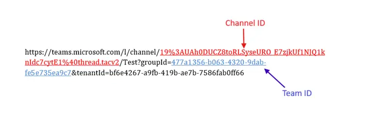ここで表示されるリンク文字列には、チーム ID とチャネル ID が含まれています。