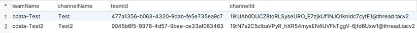 ドライバーを使用する場合、Teams テーブルからチームの一覧を、Channels テーブルからチャネルの一覧を取得できます。たとえば、以下の SQL を実行すると、チーム名、チーム ID、チャネル名、チャネル ID の一覧を取得できます。