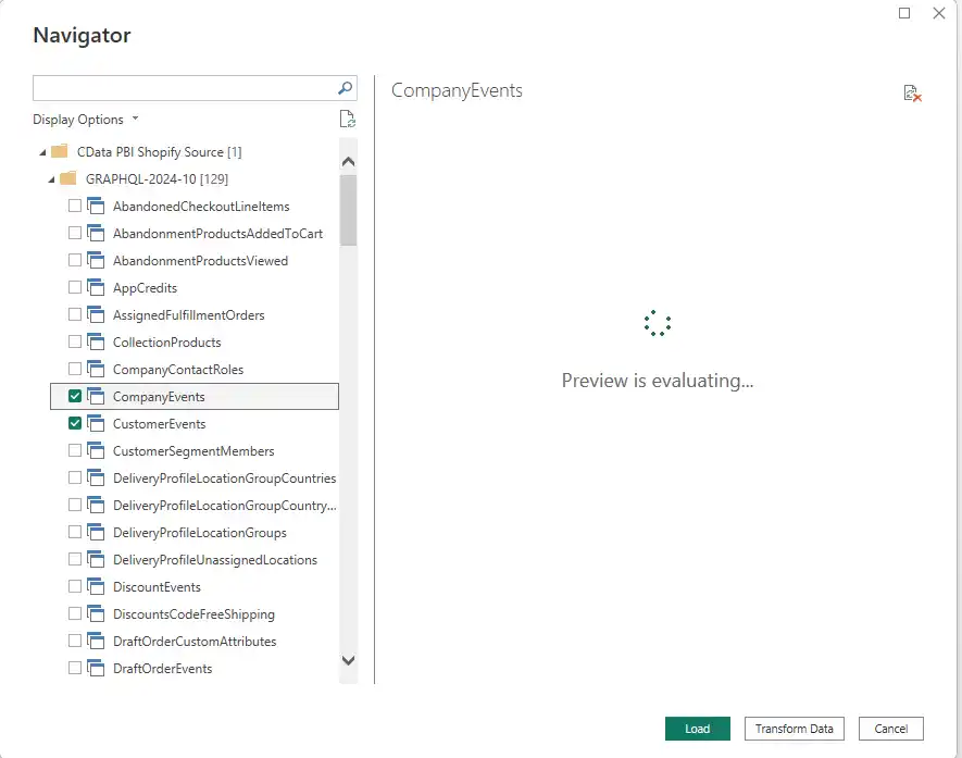 ナビゲーターに GraphQL スキーマで使用できるテーブルが表示されます。分析したいテーブルを選択して Power BI にインポートします。