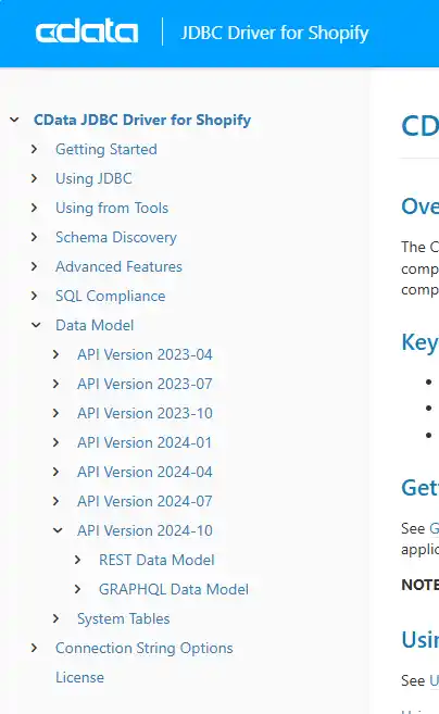 CData Shopify ドライバーは REST Admin API だけでなく、GraphQL Admin API もサポートしています。ドキュメントでは REST スキーマと GraphQL スキーマの両方を確認できます。