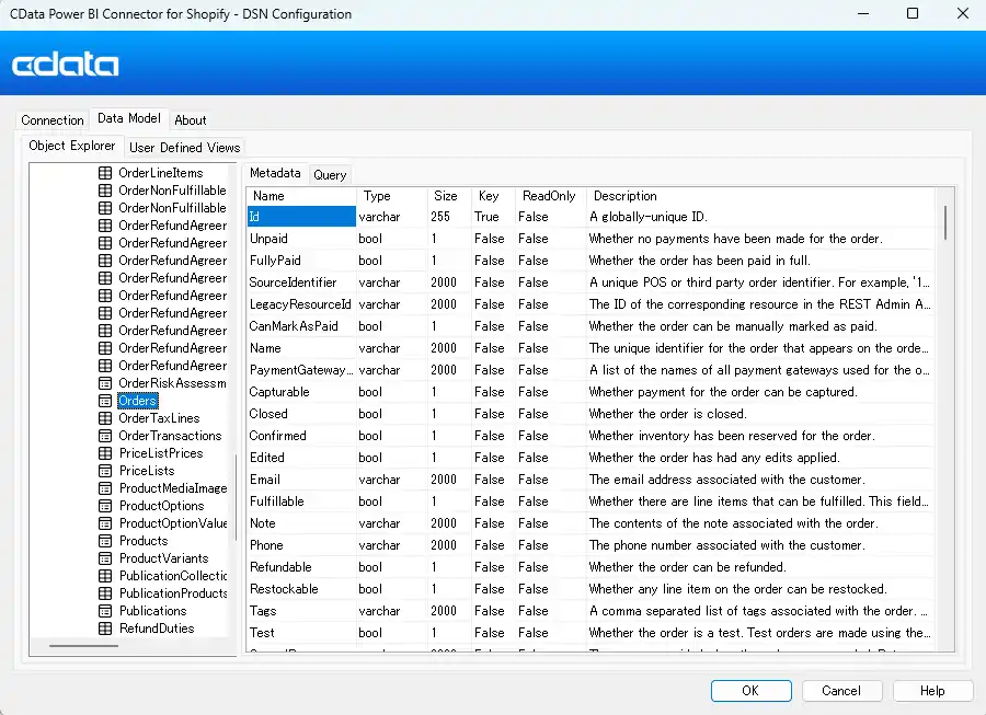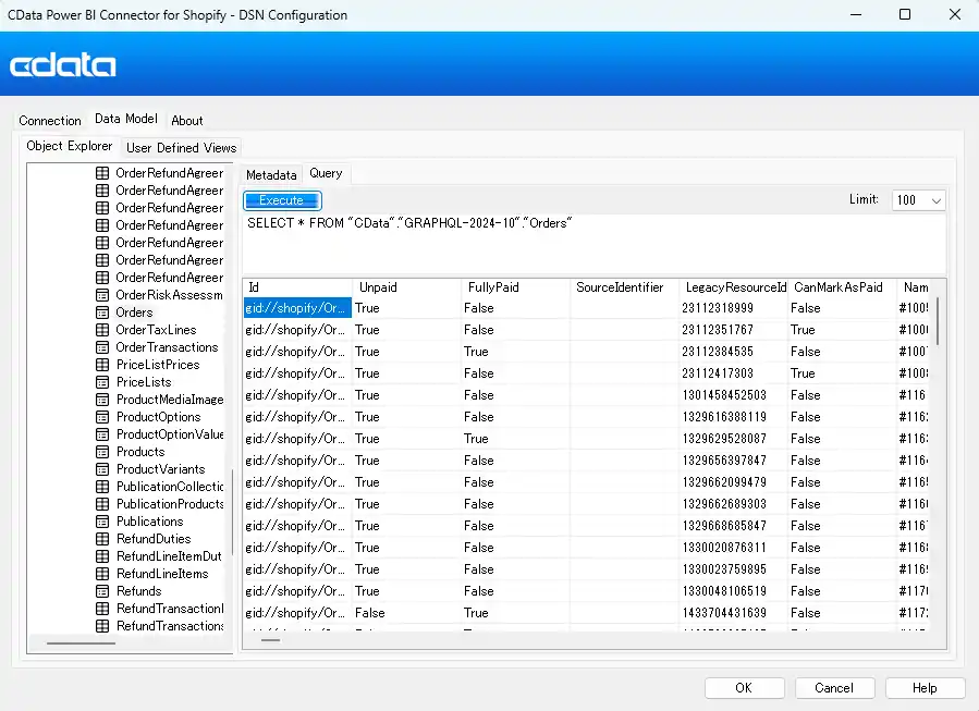 REST Admin API のレガシーステータス発表を受けて、ドライバーのデフォルト API は GraphQL に変更されました。通常、GraphQL Admin API を使用する場合は、GraphQL の仕様、データ構造、データアクセス時の API クエリコストを意識する必要があります。しかし、CData Shopify ドライバーを使用すれば、Tableau や Power BI などを利用する BI ユーザーにとって扱いやすい表形式のデータモデルに自動変換されます。REST API と GraphQL の違いを意識する必要はありません。
