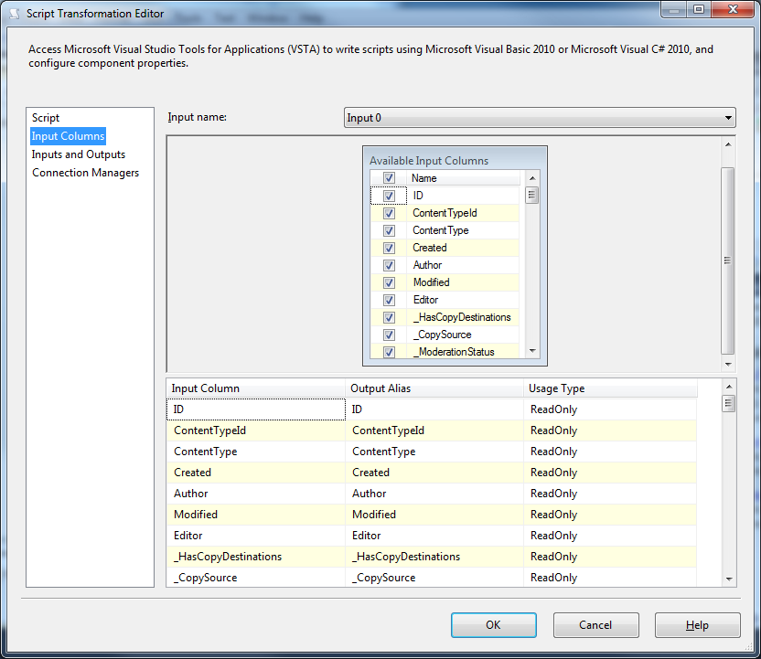 - スクリプトコンポーネントを開き、入力カラムペインですべてのカラムを選択します。