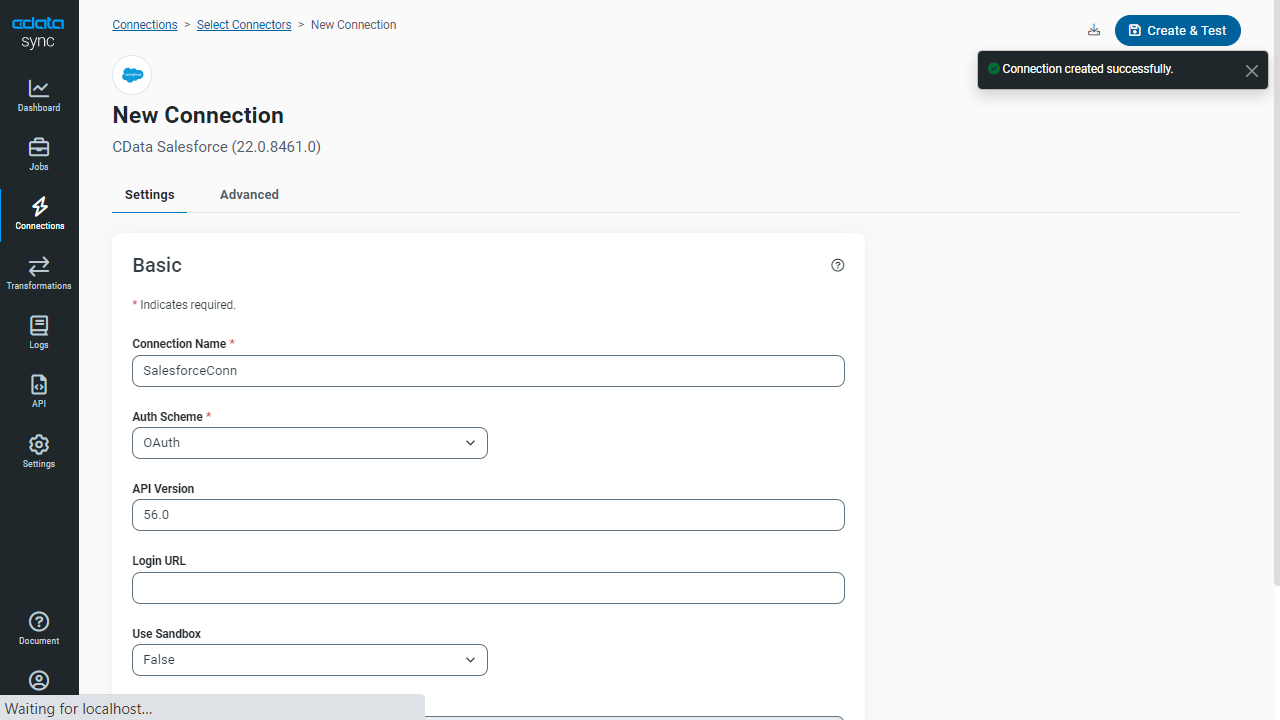 - 「Create and Test」をクリックして、データソース接続を保存します。