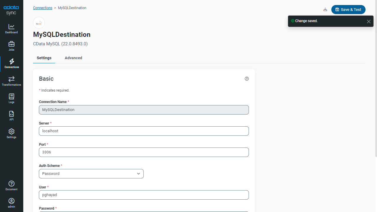 - 「Save and Test」をクリックして、レプリケーション先接続を保存します。