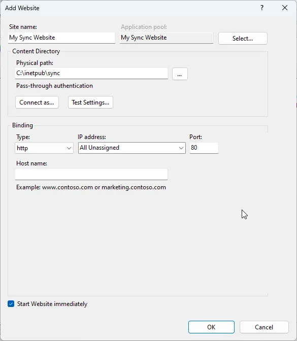 - Physical path - 先ほど作成したフォルダの物理パス(例:C:\inetpub\sync)