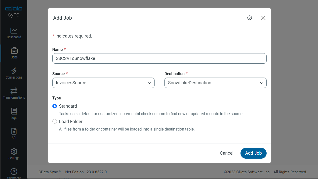 - ジョブに名前を付け、先ほど作成した CSV ソースと Snowflake 同期先の接続を選択します。