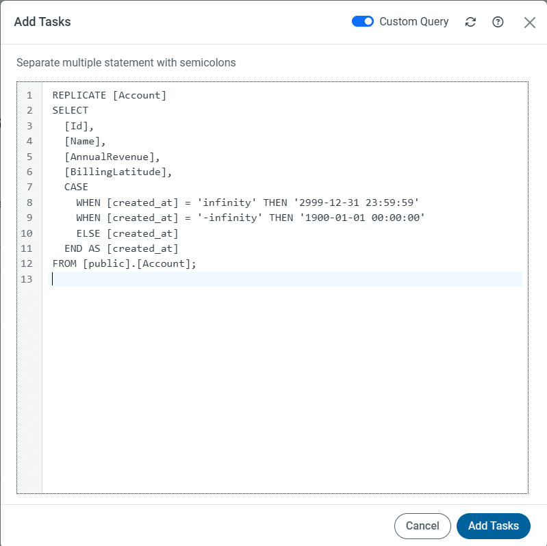 接続プロパティ replaceInvalidTypesWithNull=true を設定する代わりに、CASE 式を使用したカスタムクエリで、データ同期時に infinity および -infinity 値を直接変換して取り込むことができます。