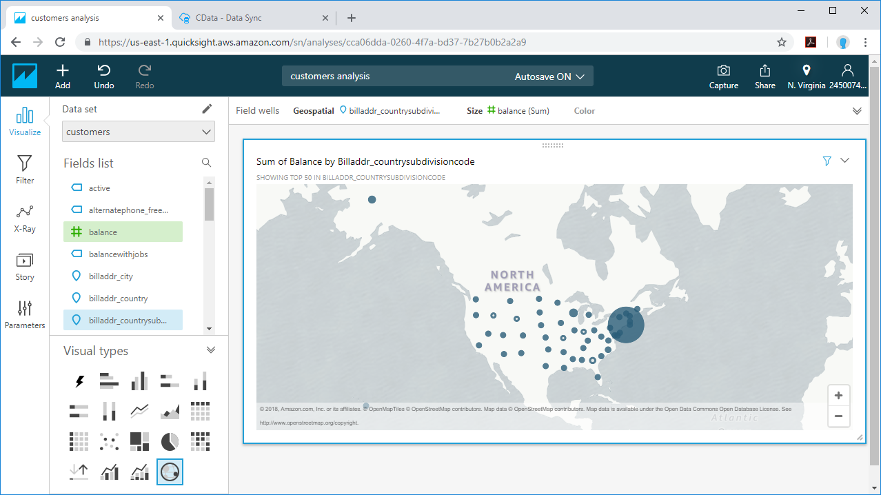 データをレプリケーションした後は、Amazon のサービス群を使用してデータのクエリと可視化を行うことができます。CData Sync は、Amazon S3 にレプリケーションされたデータに基づいて Amazon Athena でリソースを作成するために使用できる Hive DDL ステートメントを自動生成できます。これらのリソースを設定すると、Amazon のクラウドベースのビジネスインテリジェンスサービスである Amazon QuickSight でレプリケーションデータを操作できます。