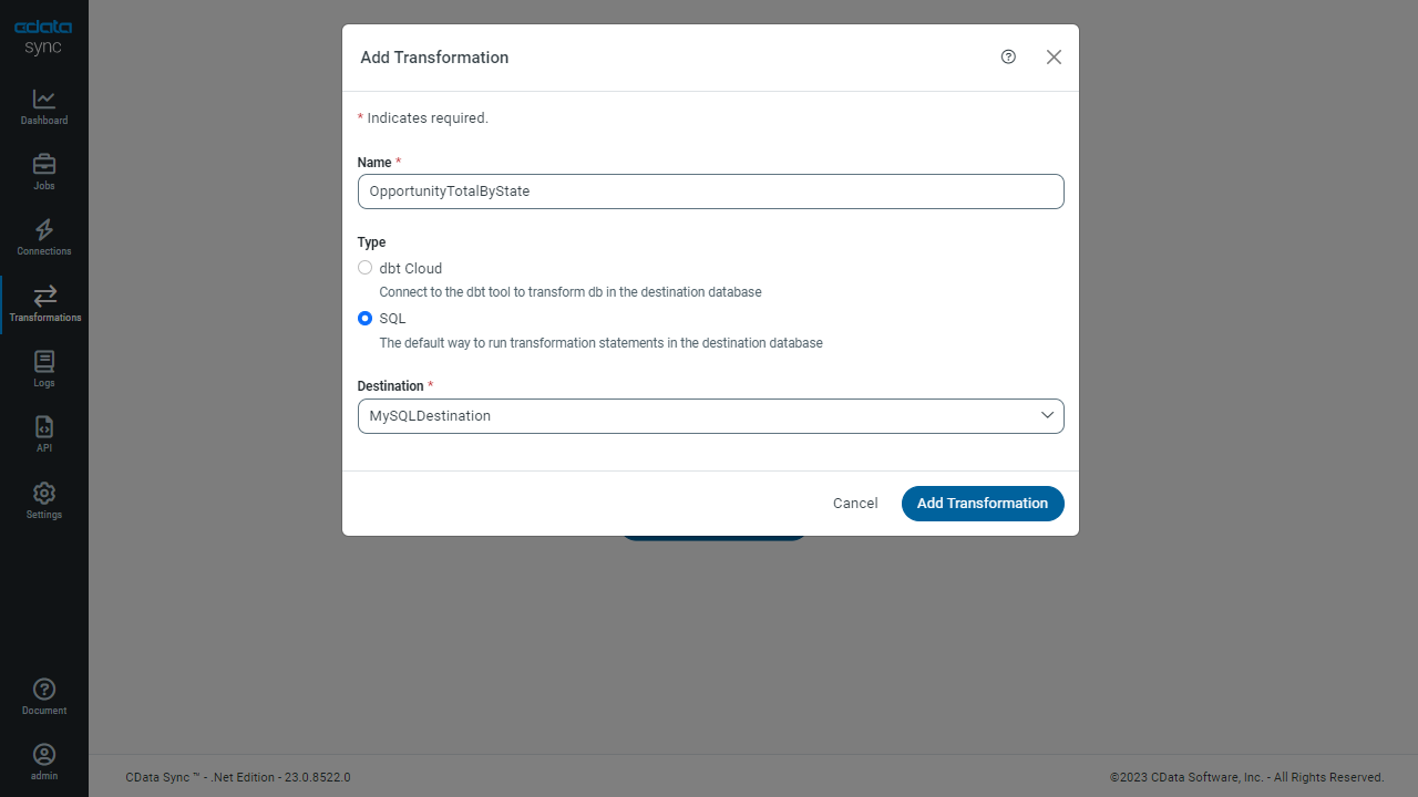 - ナビゲーションバーの「Transformations」タブをクリックし、「+Add Transformation」を選択します。 変換に名前を付け、変換タイプと同期先を選択します。「Add Transformation」をクリックします。