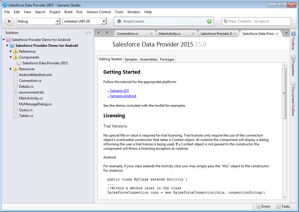 SalesforceCommand command = conn.CreateCommand(); command.CommandText = "UPDATE Account SET Name = 'John Doe'"; return command.ExecuteNonQuery();Open any of the sample projects for details on how to perform basic data access in Xamarin applications. In the help documentation, you can find more data source–specific information, including tutorials on using the Xamarin provider with Entity Framework and LINQ.