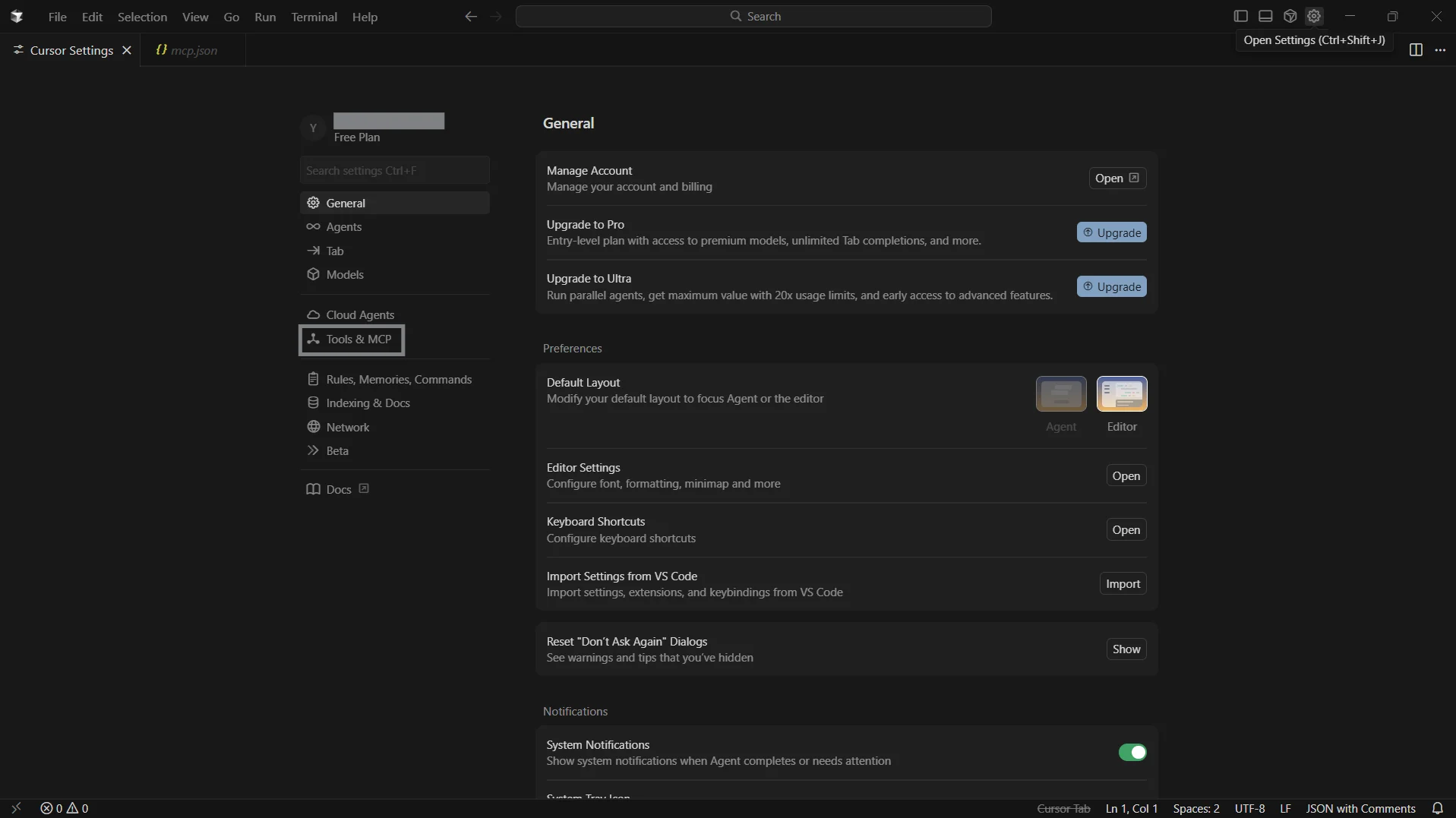 - Cursor がエディタで mcp.json ファイルを開きます