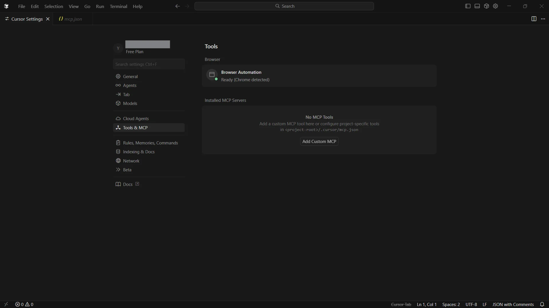 左側のナビゲーションで Tools & MCP タブを開き、Add Custom MCP をクリック