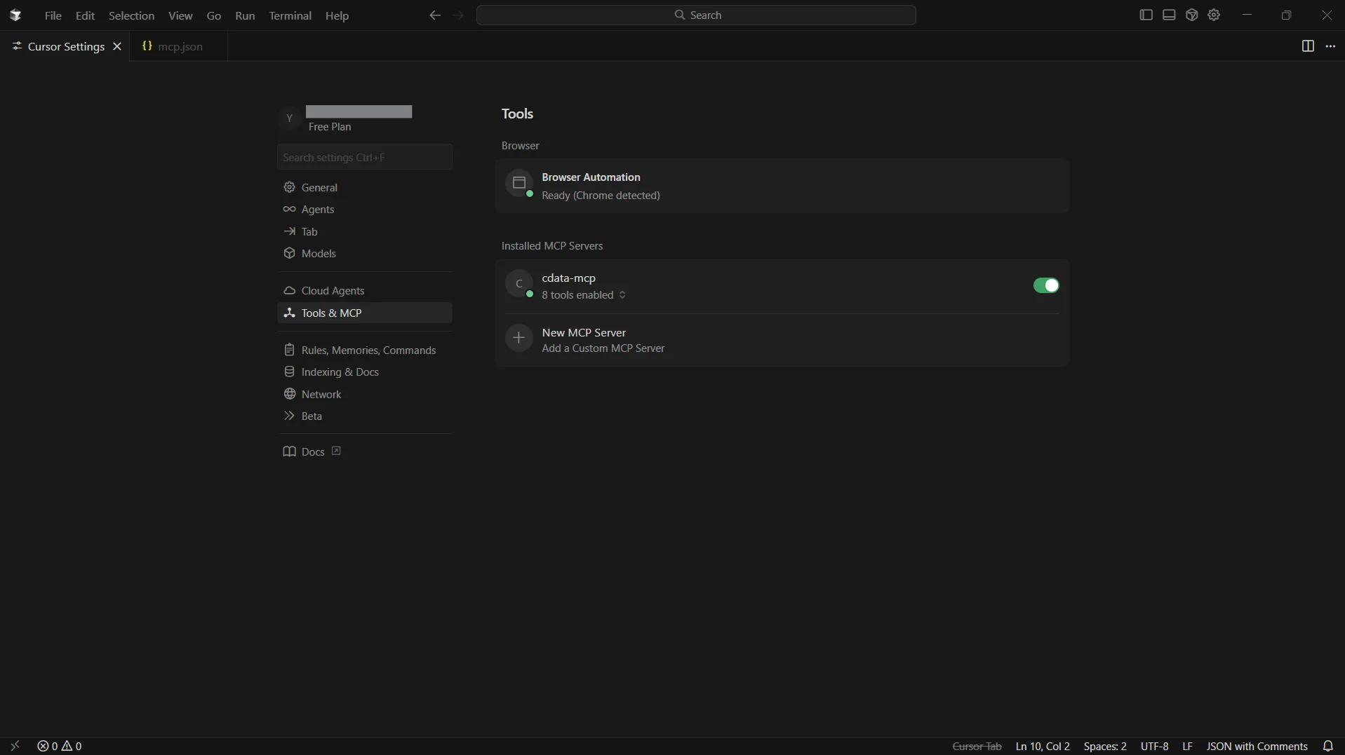 Settings に戻り、Tools & MCP を選択します。cdata-mcp が有効なインジケータとともに表示されていることを確認できます