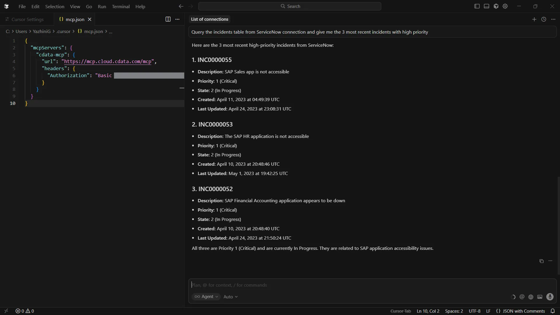 これで、Cursor と CData Connect AI MCP Server の統合が完了し、エディタから直接リアルタイムのAPI のデータを操作できるようになりました。
