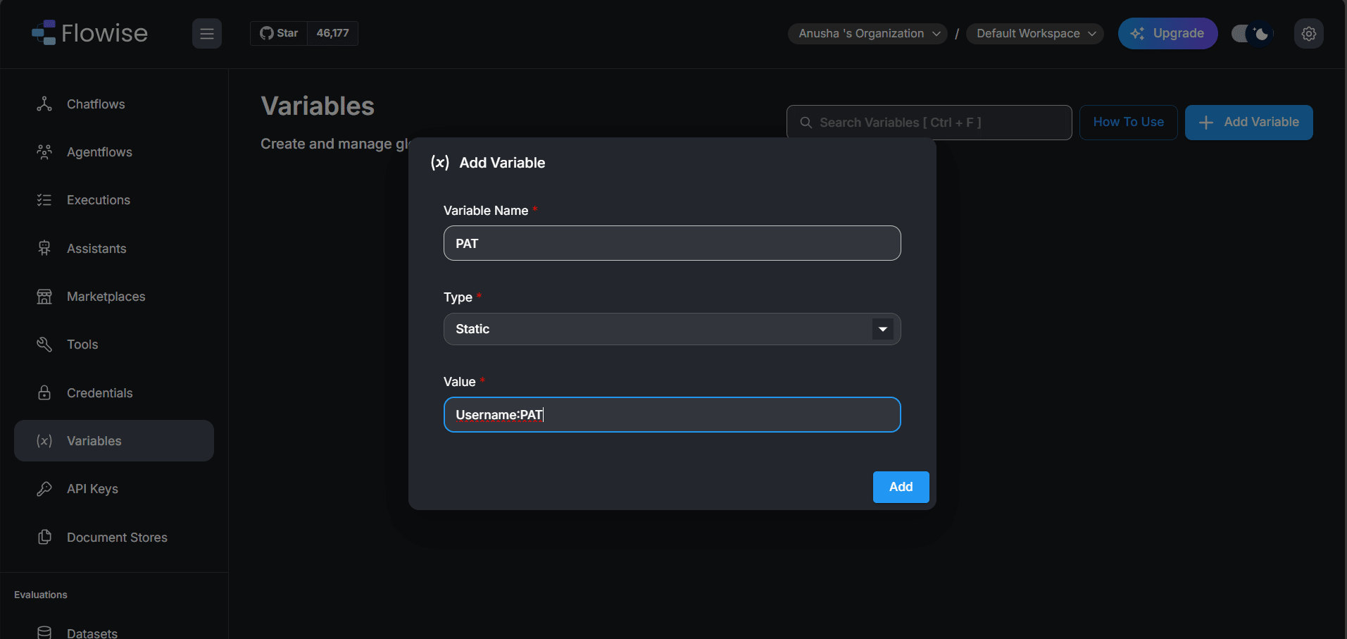 - Variable Name(例:PAT)を設定し、タイプを Static に選択、Value に Base64 エンコードした username:PAT を設定