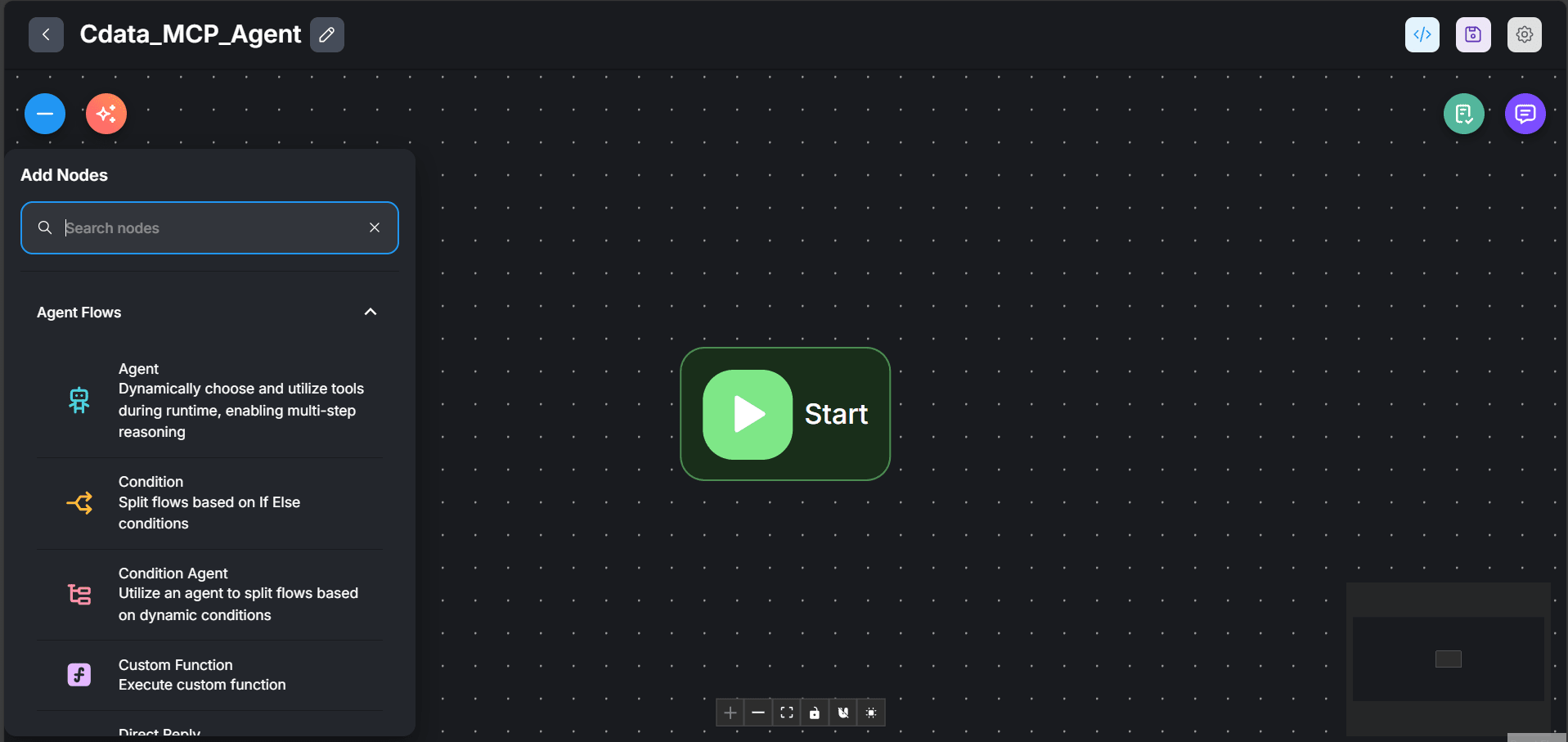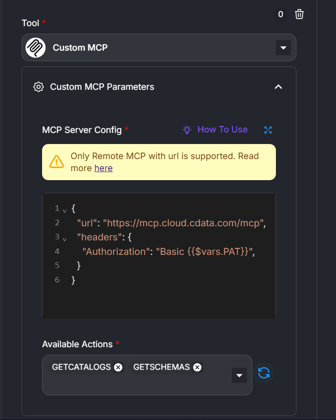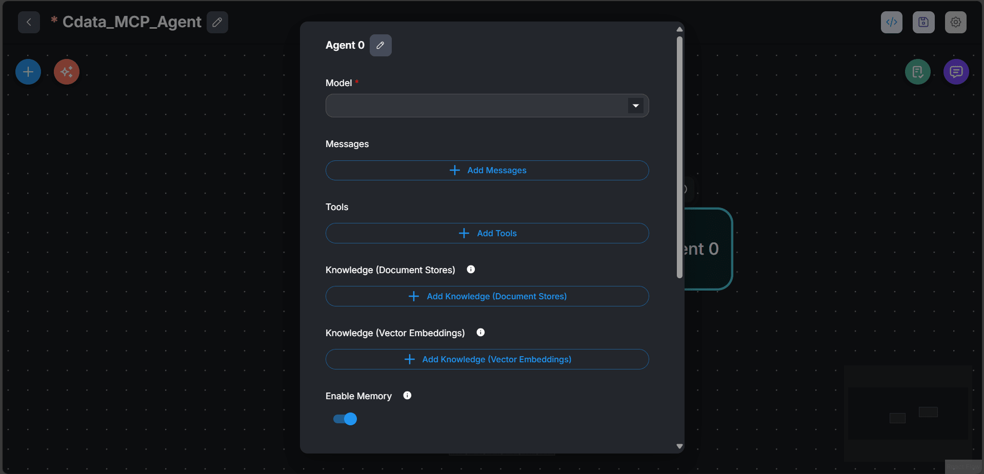 更新アイコンをクリックして利用可能な MCP アクションを読み込みます。アクションが一覧表示されたら、Flowise エージェントが CData Connect AI MCP に正常に接続されています。
