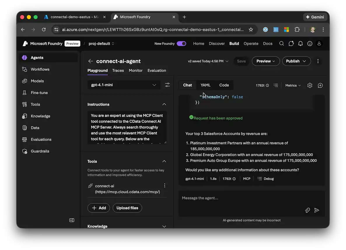 エージェントは CData Connect AI MCP Server を使用してリアルタイムのAPI のデータをクエリし、ライブデータに基づいた回答を提供します。