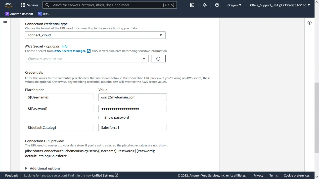 AWS Secrets Manager にプロパティを保存する場合は、プレースホルダー値(例:${Property1})をそのままにしておきます。そうでない場合、AWS Glue 接続インターフェースで入力した値は、プロパティの下の(読み取り専用の)JDBC URL に表示されます。