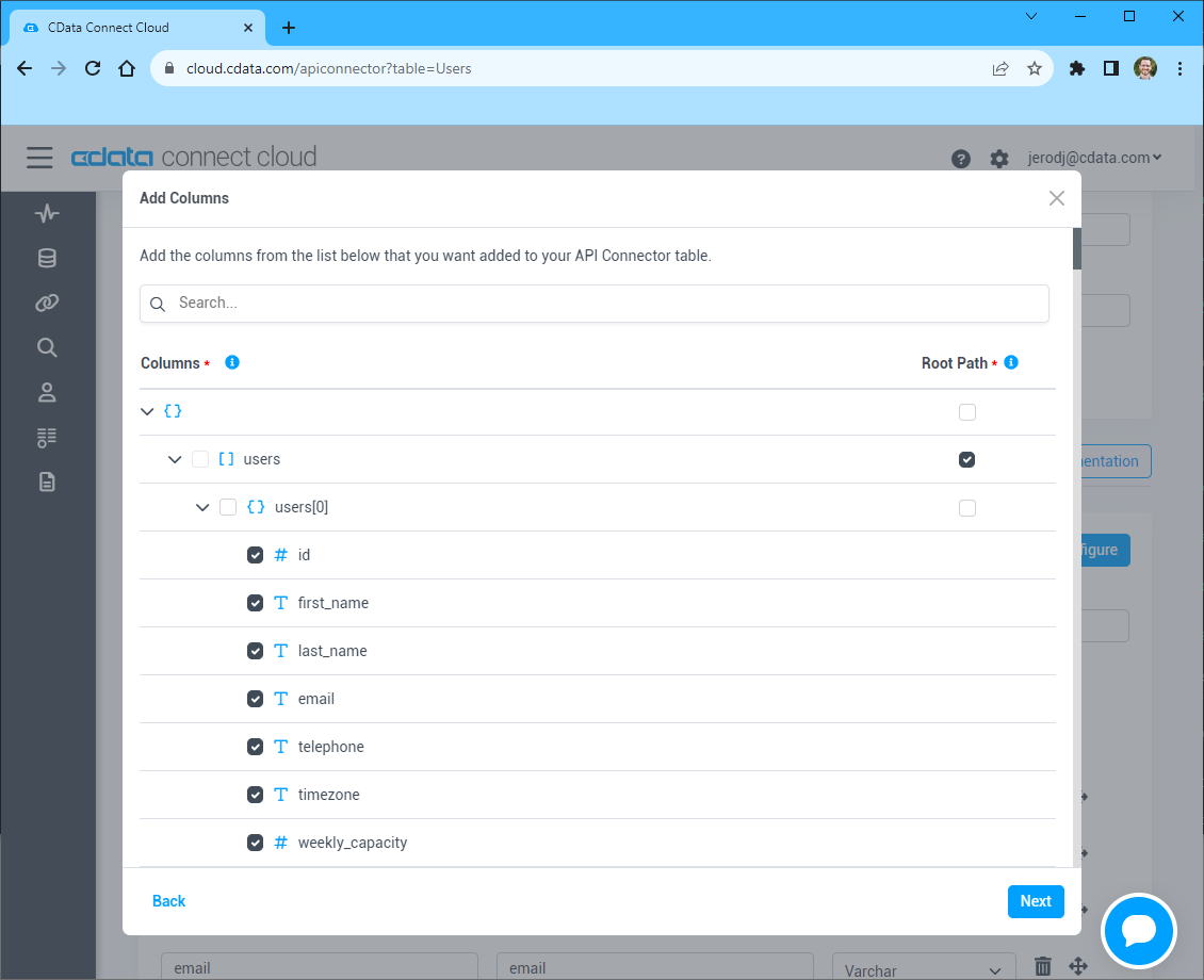 - Looker Studio のCData Connect AI Connector でコネクション(例:API1)を選択し、「Next」をクリックします。