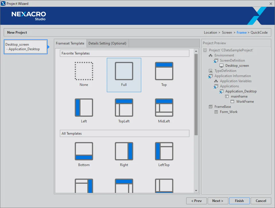- Template から「Full」を選択して、「Finish」をクリックします。
