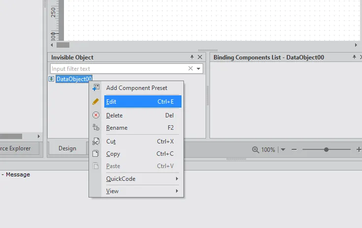 - DataObject を配置すると、Invisible Object の一覧に配置したDataObject が表示されるので右クリックから「Edit」を選択します。