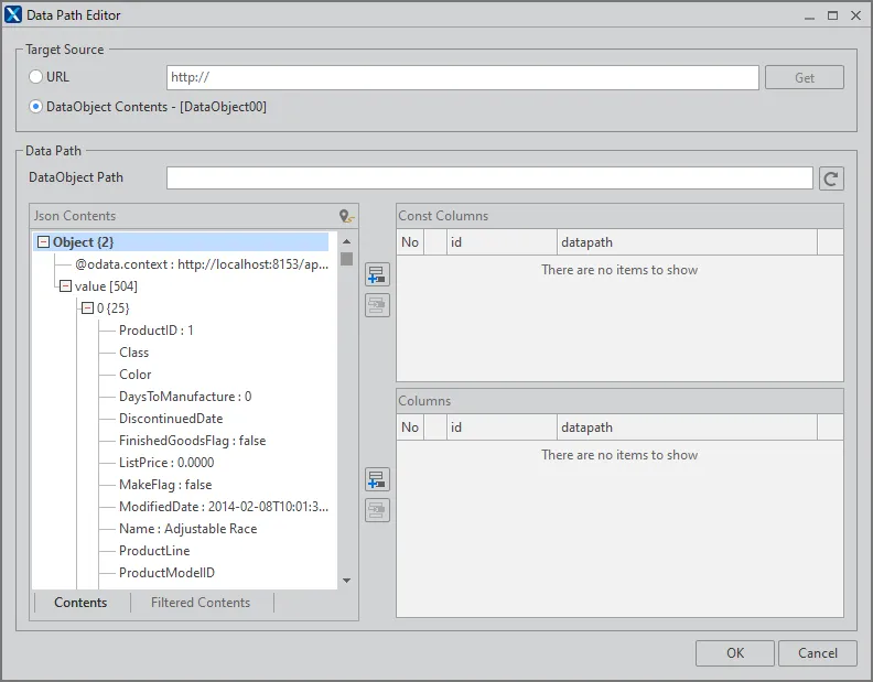 - 作成したDataset の「binddataobject」で先ほど作成したDataObject を選択し、次に「dataobjectpath」を編集します。