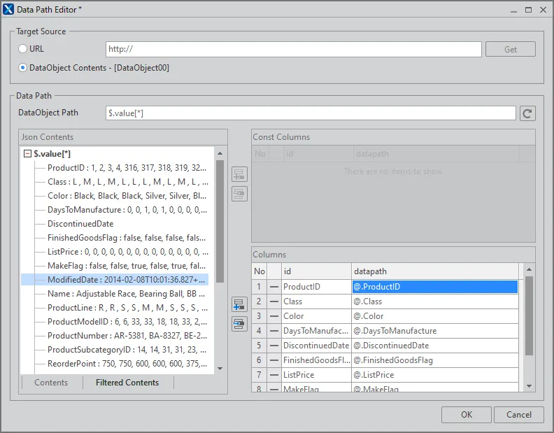 - 以下のようなData Path Editor という画面で、JSON のオブジェクト構造をどのようにマッピングするかを構成できます。