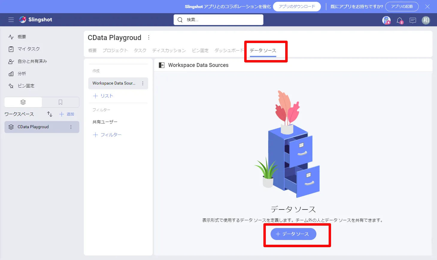 - Slingshot の対象のワークスペースに移動して「データソース」タブに移動し「+データソース」をクリックします。