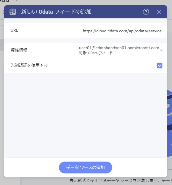 - 「URL」にOData エンドポイントのURL を指定し「先制認証を使用する」にチェックを入れます。その上で「資格情報」を追加しましょう。
