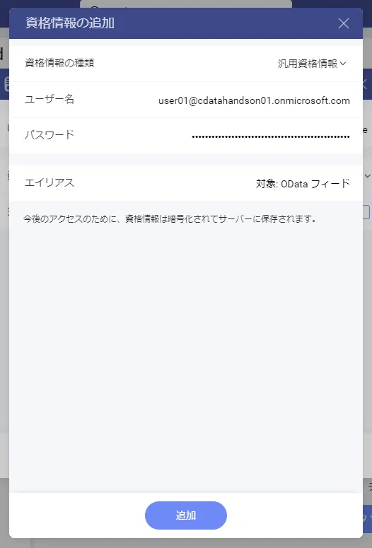 - 資格情報の種類は「汎用資格情報」になります。合わせてCData Connect AI へのログインユーザーIDをユーザー名に入力し、パスワードには先程生成したPAT を入力します。