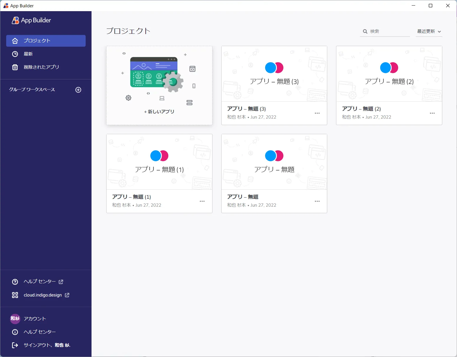 - App Builder を立ち上げて「+新しいアプリ」をクリックします。