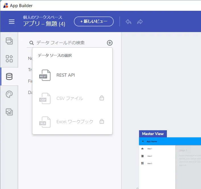 前述の通りApp Builder ではREST API に接続したアプリを手軽に作成することができます。API 接続部分はあらかじめデータソースとして定義しておくことで、簡単にUI とバインドすることができるようになるので、まずはこのデータソースの準備を進めます。