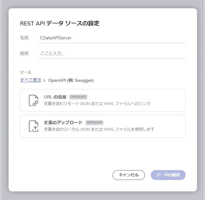 - ここでは先程CData Connect AI からダウンロードしておいたOpenAPI の定義を使用するので「定義のアップロード」をクリックします。